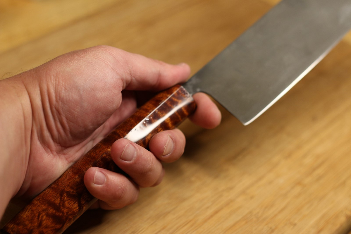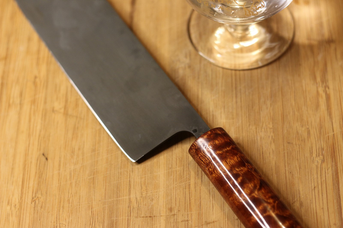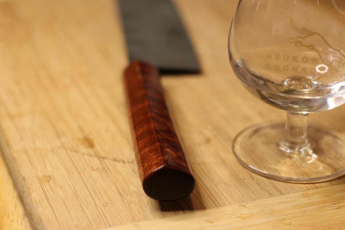 Зонная закалка в воду, примерно 56-58ХРЦ, рукоять из вишни, покрытая натуральным лаком кэшью. Режет неплохо, довольно удобный, рукоять возможно со временем переточу в сторону утоньшения к клинку. Всадной монтаж на эпоктидку.