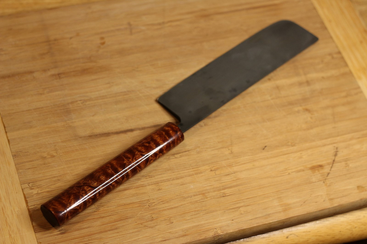 Досмотрелись с ней до того, что предложил ей сделать новый ножик на кухню. Полоса в полтора мм 1095 была, дерева дома хоть печку топи, горелка есть, за пару дней управились.