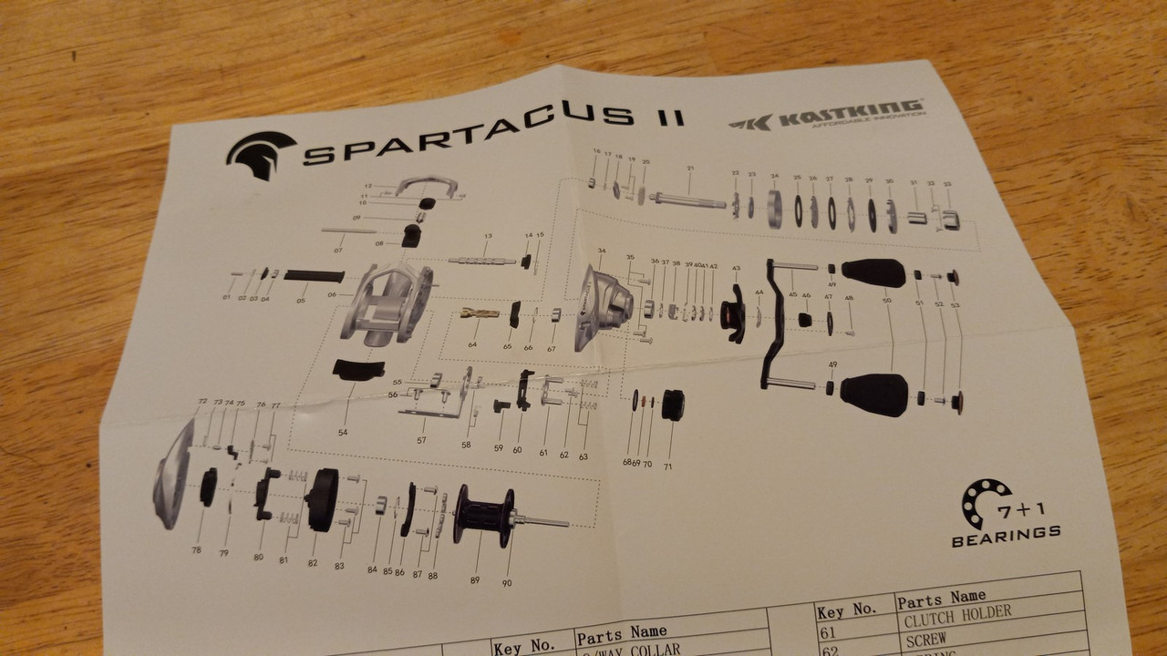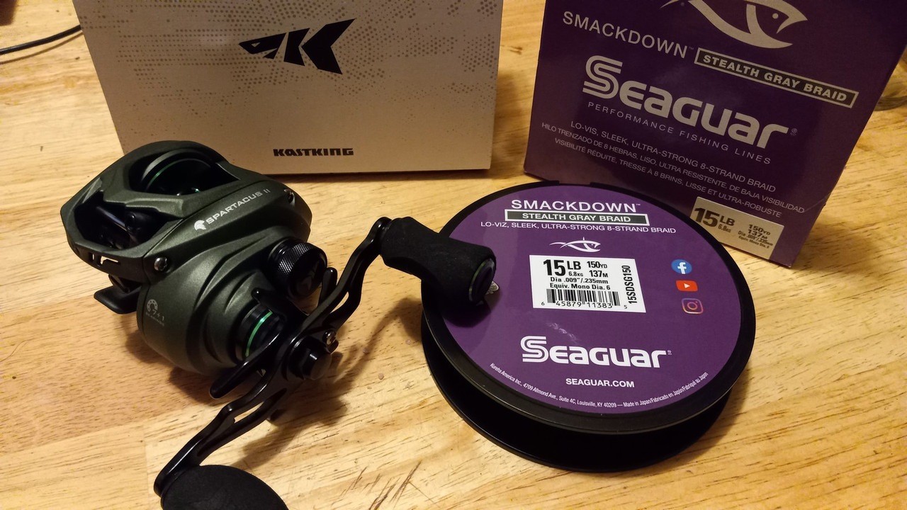 Итак, что пока приехало: катушка кастинг КастКинг Спартак 2, леска Смакдаун Сегуар, плетёнка из 8-ми синтетических линий вокруг центра, 15 фунтов на разрыв и толщиной в 6 тысячных дюйма. С ума сойти. 150 ярдов за $25.